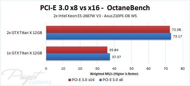 Before we get too far into our testing, the first thing we want to do is to determine if there is any performance difference between running a video card at x8 or x16 speeds with Octane Render. While PCI-E 3.0 x16 technically has twice the bandwidth of PCI-E 3.0 x8, it is very rare for a program to fully saturate even PCI-E 3.0 x8 so we do not expect to see a difference in performance. If there is a performance difference, however, we want to know that before we get into the majority of our testing as it could change some of our testing methodology.