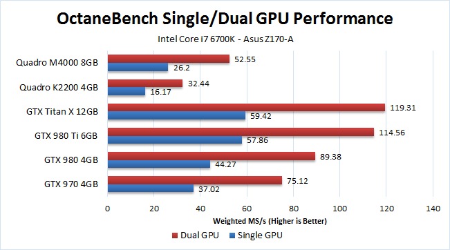 Somewhat surprisingly, the results on the Intel Core i7 6700K system are almost identical to what we saw on the dual Xeon system. Typically, software either performs better either on system with either a higher frequency (like our Core i7 system) or one with a large number of cores (like our dual Xeon system), but Octane Render is actually very platform-independent. In fact, the biggest difference in performance we saw between the two platforms was just 1.5% – and it wasn't even consistent which platform was faster!
