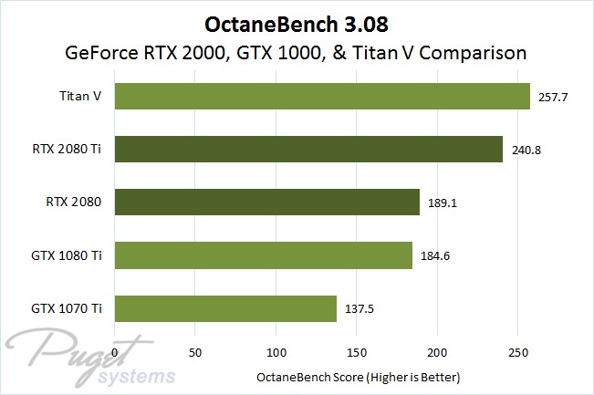 Finally, it is worth noting that this version of OctaneRender is not yet able to utilize the new RT cores which NVIDIA added to this generation of GPUs. Those are purpose-built for raytracing, and if Octane is updated to use them in the future we could see a huge increase in performance. We will be sure to test these cards again if or when that technology is integrated into this rendering engine.