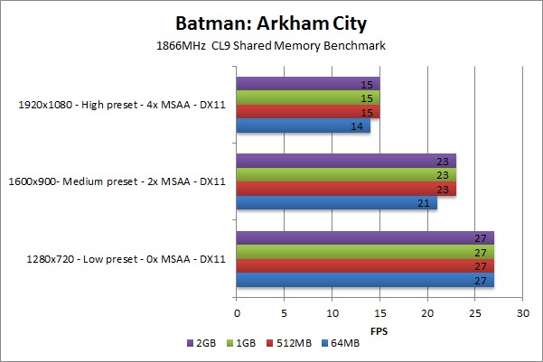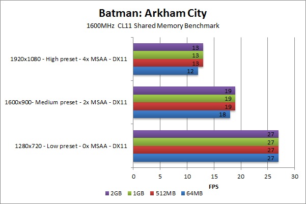 The results for Batman: Arkham City appear to be in-line with the Tom's Hardware article. At 1280×720 with low presets, the amount of shared memory did not matter at all. Once the resolution and settings were turned up, however, 64MB of shared memory was not enough and resulted in a 9% decrease in performance at medium and 7% decrease in performance on high.