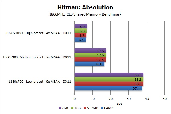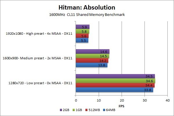 Hitman: Absolution is a bit different in that even at the low resolution/settings there is a slight performance drop when the shared memory was set to 64MB. At low, the difference is only 2%, however, so that may very well simply be normal testing variation. 512MB of shared memory has a very slight performance loss at medium and high, but ~.2 FPS is so small that it is well with normal testing variations.