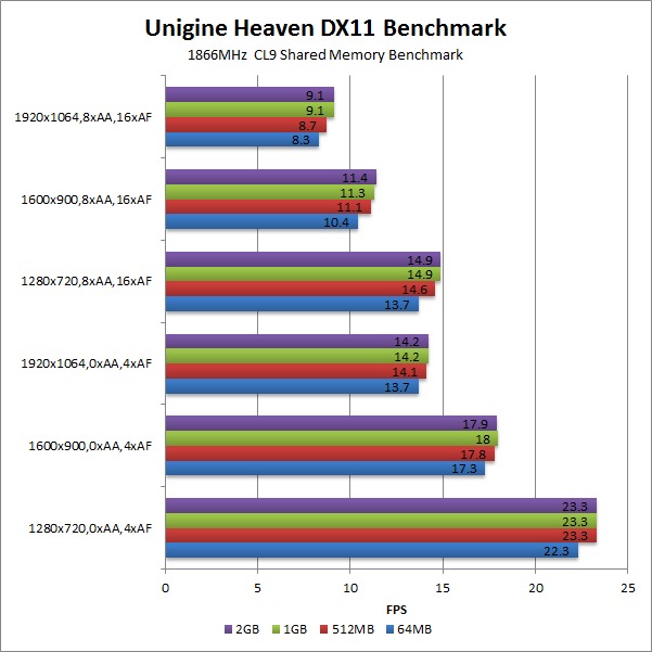 So what does this mean in terms of real-world performance? At the settings that actually matter for gaming (basically those that allow the game/benchmark to run at over 30 FPS) there was only a 1-2% performance difference between 64MB and 512MB of shared memory, and no difference above 512MB. In fact, none of our benchmarks except Unigine Heaven showed any difference between 512MB, 1GB and 2GB of shared memory at any resolution/settings.