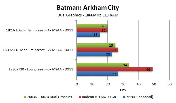 We will be running three rounds of benchmarks. One with just the APU's onboard graphics (7660D), one with just the Radeon HD 6670 1GB, and one with Dual Graphics enabled.