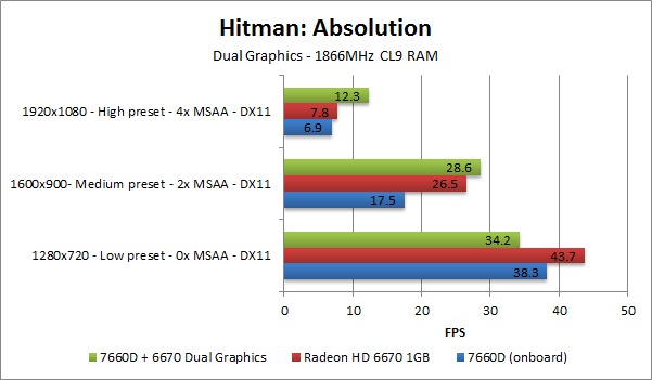 Hitman: Absolution is a bit of a mixed bag. At the lowest resolution/settings (which is what most users would be running with this configuration) there is again a performance drop (roughly 22%) with Dual Graphics enabled. Interestingly, we did see an improvement at the medium and high settings.