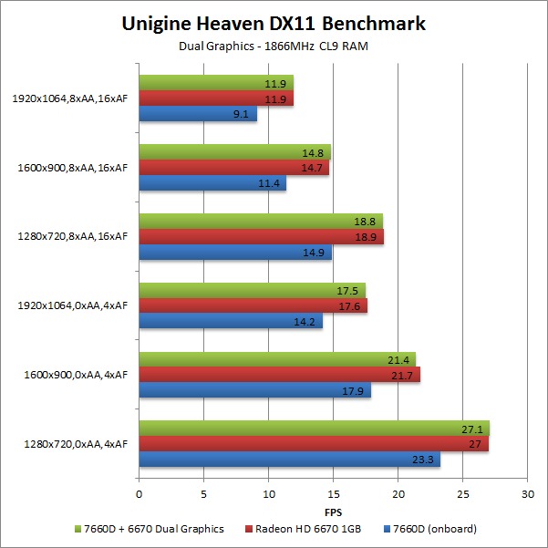 Not every title will work with Dual Graphics, and the Unigine Heaven benchmark shows this in a way that we expected. Across the board, there was no difference with Dual Graphics enabled compared to just using the Radeon HD 6670 alone. This is what is supposed to happen if Dual Graphics is not compatible with a game – the system simply uses the discrete video card exclusively.