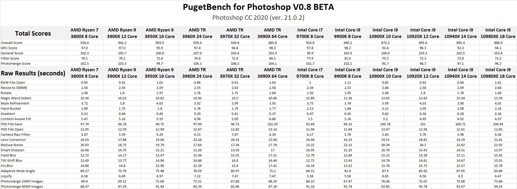 As we mentioned at the start of this post, Photoshop does not typically use more than a handful of CPU cores which means that the "per-core" performance (determined by the Turbo clocks) is typically what determines how well a CPU will perform. And since most modern CPUs have very similar "Max Turbo" speeds, all the CPUs we tested should perform very similarly.