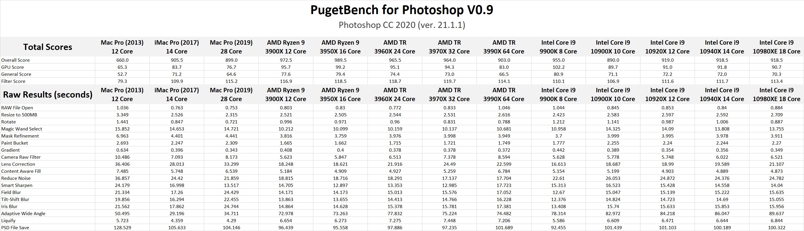 Photoshop is an interesting application to look at since in most cases, it does not take advantage of CPUs that have a large number of cores. That means that the 28 cores in the Mac Pro are not being used to its full potential, but neither are the 18, 32, or 64 cores that are found in some of our PC configurations.