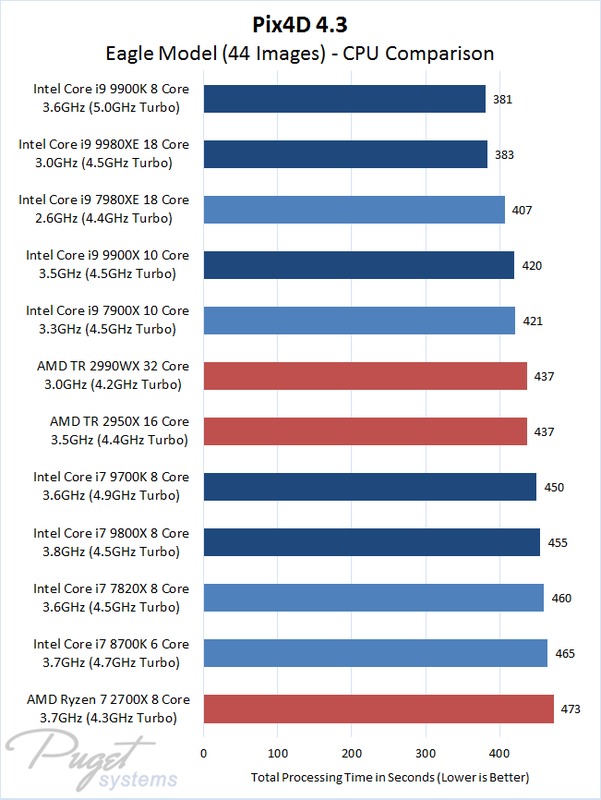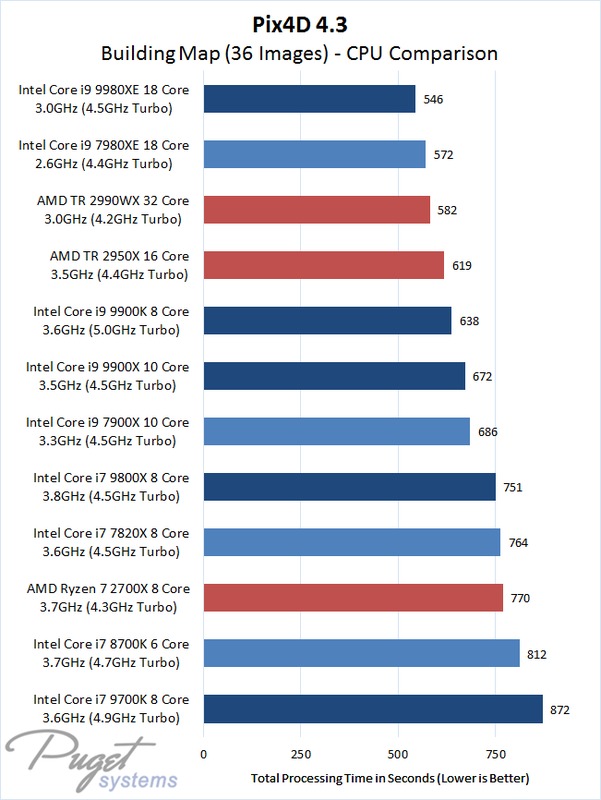 This is the only test where the mainstream Core i9 9900K led the results, thanks to the short test length and this processor's high clock speed. 3D Models have fewer processing steps in Pix4D, and with only a handful of images in this project the higher core count chips don't have a chance to flex all their power. Still, the lower clock speed i9 9980XE basically tied for first place (2 seconds slower is well within the margin of error here) and as we will soon see that chip handles more complex projects better than the 9900K.