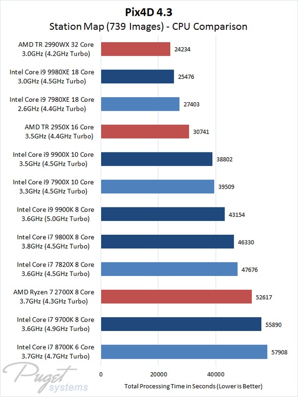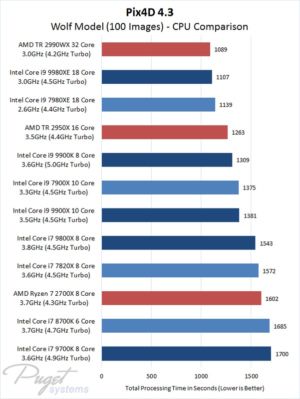Pix4D is sensitive to both clock speed and core count, but as the number of images in your project increases so does the importance of core count. With projects of 100+ images, we found that AMD's Threadripper 2990WX was the fastest CPU available – even though some of the Intel models we tested cost more. For smaller image sets, with fewer than 100 photos, Intel chips were faster… but even then, moving from a 3D Model to a 3D Map (which requires additional processing) impacts which chip is the fastest.
