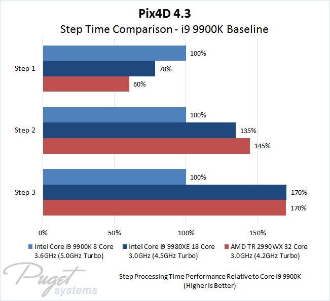The biggest takeaway here is that Step 1, which is comprised mostly of aligning the images, is heavily dependent on clock speed. In tests where there are only a handful of images, such that this step takes up a substantial portion of the total processing time, a high clock speed processor like the Intel Core i9 9900K will do very well. That is what we saw with the Eagle Model image set, where this CPU was 43 seconds faster than the i9 9980XE in Step 1 – and while it was 41 seconds slower in Step 2, that still left it 2 seconds ahead overall.