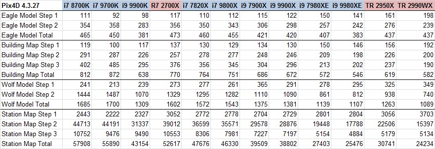 The 9900K continued to be faster than any of the higher core count processors during Step 1 across all the remaining image sets. However, as the projects got larger, Step 1 became a smaller and smaller part of the overall processing time – which is why the 9900K never took the top spot in maps or larger models. Interestingly, though, the i7 9700K actually bested the 9900K in Step 1 speed across the board, despite having slightly lower clock speeds and no Hyperthreading. That actually makes me suspect that something in the way calculations are handled in Pix4D's Step 1 is hampered by having more CPU "threads" available, such that higher thread count chips are actually performing more slowly than they should be. There are ways to artificially limit how many cores are available to a given program within Windows, which could potentially help here, but limiting threads that way would greatly hurt performance in subsequent steps.