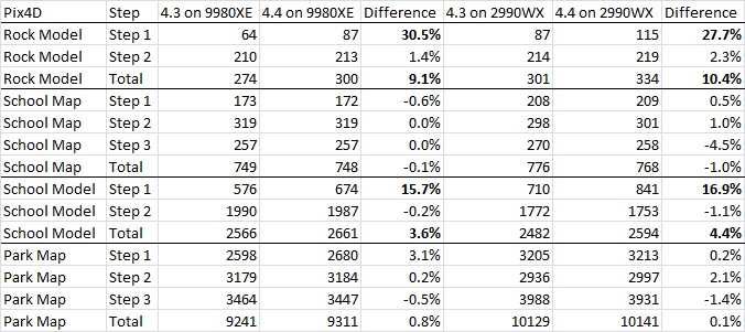 It looks like performance in Pix4D 4.4.12 is actually a bit slower than in the previous release – particularly when processing 3D Models. To dig a little deeper into what is going on, here is a table showing how long each step took on each combination of CPU and version:
