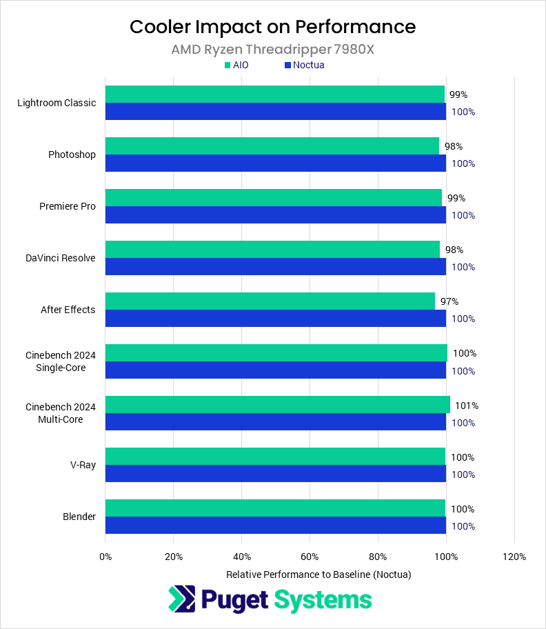 Bar chart of relative performance between an AIO and Noctua air cooler.