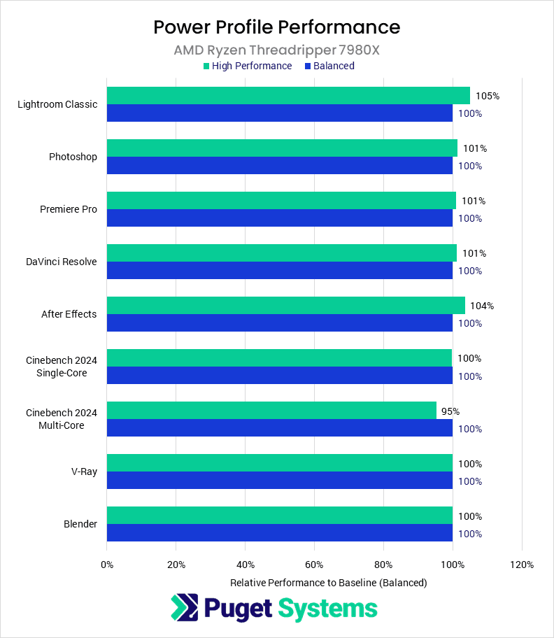 In our Intel Xeon W Content Creation Review, we investigated how the power profile being used had a massive impact on performance, with the Xeon CPUs gaining an average of 20% performance increase when run with the High-Performance power plan. Luckily, the Ryzen Threadripper 7000 Series processors have no such requirement. Overall, every benchmark was within the margin of error regardless of the power plan. We do observe that there is a 5% improvement in Lightroom Classic and a 5% performance detriment in Cinebench 2024 multi-core; these are potentially indicative of an actual difference, but we cannot say definitively, and it is small regardless.