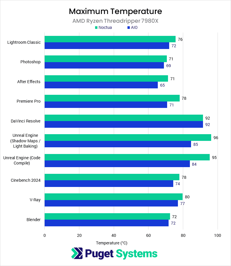 Bar chart of maximum temperature between an AIO and Noctua air cooler.