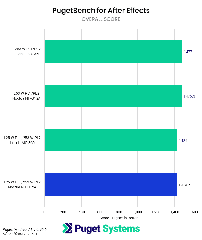 Our testing has found that most content creation applications are not that sensitive to increases in power limits. Photoshop, Lightroom, and Premiere Pro saw no real improvement, while After Effects and DaVinci Resolve saw only marginal ones; the differences were right at the margin of error for this kind of real-world testing. These are the applications that are most likely to end up with a CPU like the Intel 14900K, as they are the applications that it tends to excel in compared to other options.