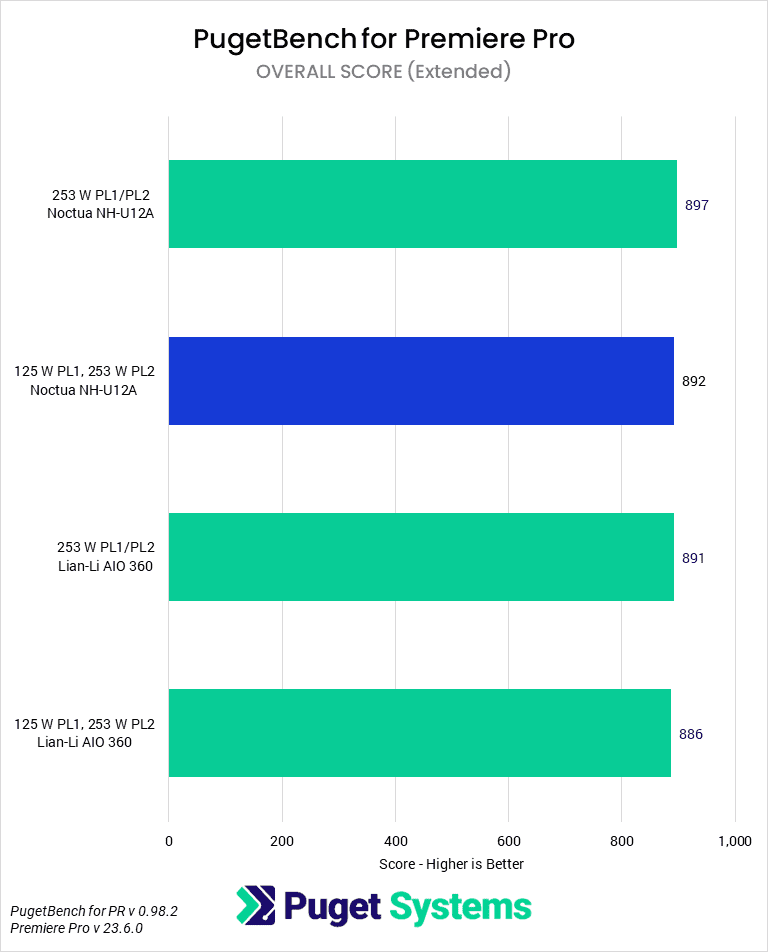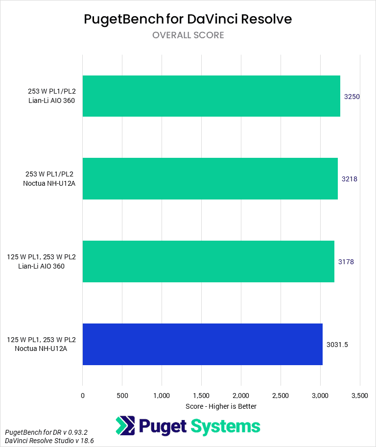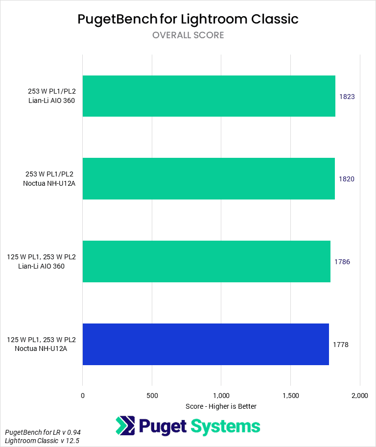 Currently, at Puget Systems, we’ve found that the balance of the factors is such that our computers make more sense targeting the 125 W power limit than the 253 W. Most of the workstations we sell with an Intel i9 CPU are for applications like Premiere Pro or Photoshop, which will not realize any benefit from the higher power limits but would see higher power draw, thermals, and noise. We expect to continue to evaluate our stance on the best way to serve our customers through power profiles over this generation of CPUs. Let us know your thoughts on these tradeoffs in the comments or how you have configured your own system to run.