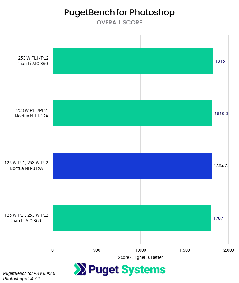 Photoshop is somewhat odd in these results in that the Noctua coolers at both power settings both drew about 70 W on average, while the Galahad coolers drew more than this. At 125 W PL1, the Lian Li drew 82 W, while at 253 W PL1, 94 W. We really don’t have a great explanation for why the Lian Li AIOs are drawing more power than the Noctua coolers. At 253 W PL1, the Galahad maintains slightly higher average clock frequencies, but the 125 W PL1 Galahad averages the same frequencies as the Noctua tests. Regardless, while the difference between 70 and 90 Watts is noticeable, both are sufficiently low as to not really matter and show that the CPU does not even require the base TDP to max out boosting in Photoshop.
