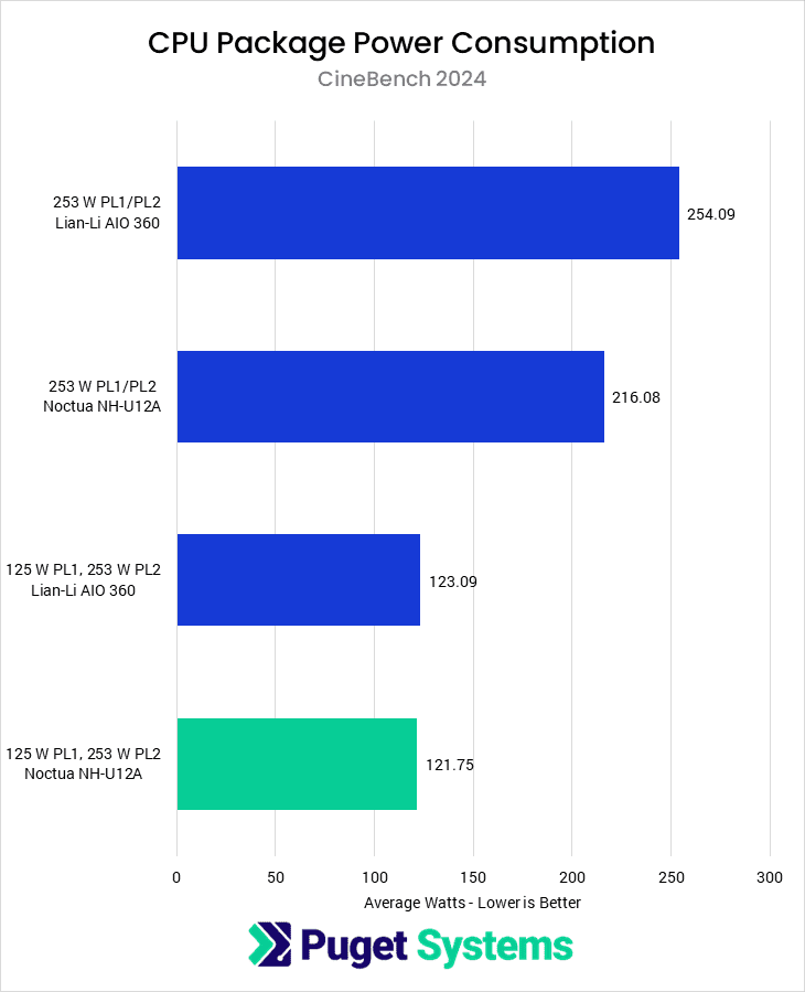 Comparing power settings, we see that increasing from 125 W PL1 to 253 W PL1 causes a large spike in temperatures of 20 to 30 degrees Celsius, depending on the cooler being used. Although a high temperature is not necessarily cause for concern in and of itself, it will frequently correlate with more noise, less headroom for additional boosting, and possibly decreased CPU lifespan.