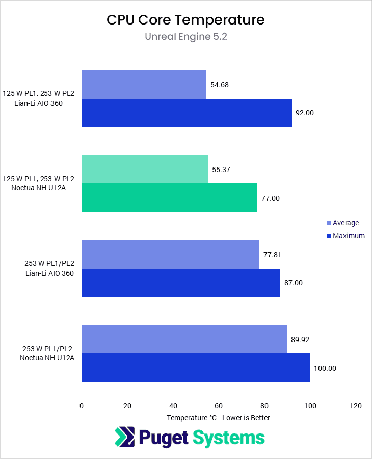Unreal Engine and Cinebench 2024 cause CPUs to behave similarly, so we will examine them together. Although distinct types of workloads, these are both demanding on the CPU and are heavily multi-threaded. In both cases, the 125 W settings produce the lowest average temperatures, and there is little difference between the two coolers. When examining the 253 W settings, the cooler makes a larger difference, with the Lian Li Galahad reducing temperatures by about 10 degrees Celsius, for both average and maximum temperatures. This shifts us from definitely thermal throttling at times to having some amount of additional thermal headroom for increasing ICCMax, operating in a less forgiving environment, or decreasing fan speed.