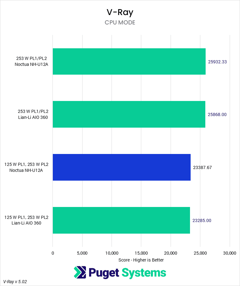 The final benchmark we tested was V-Ray. In the CPU rendering portion, we see a noticeable gap of 11% between the two power limits. Much like Blender, the Noctua nominally outperforms the Galahad at the higher power limit, although within the margin of error of the test.