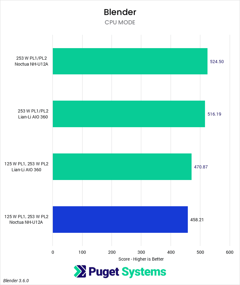 Blender shows a smaller gap than Cinebench, but it is still fairly large at 14%. Both coolers perform identically in these tests, so it once again appears that we are being limited by a factor other than thermals.