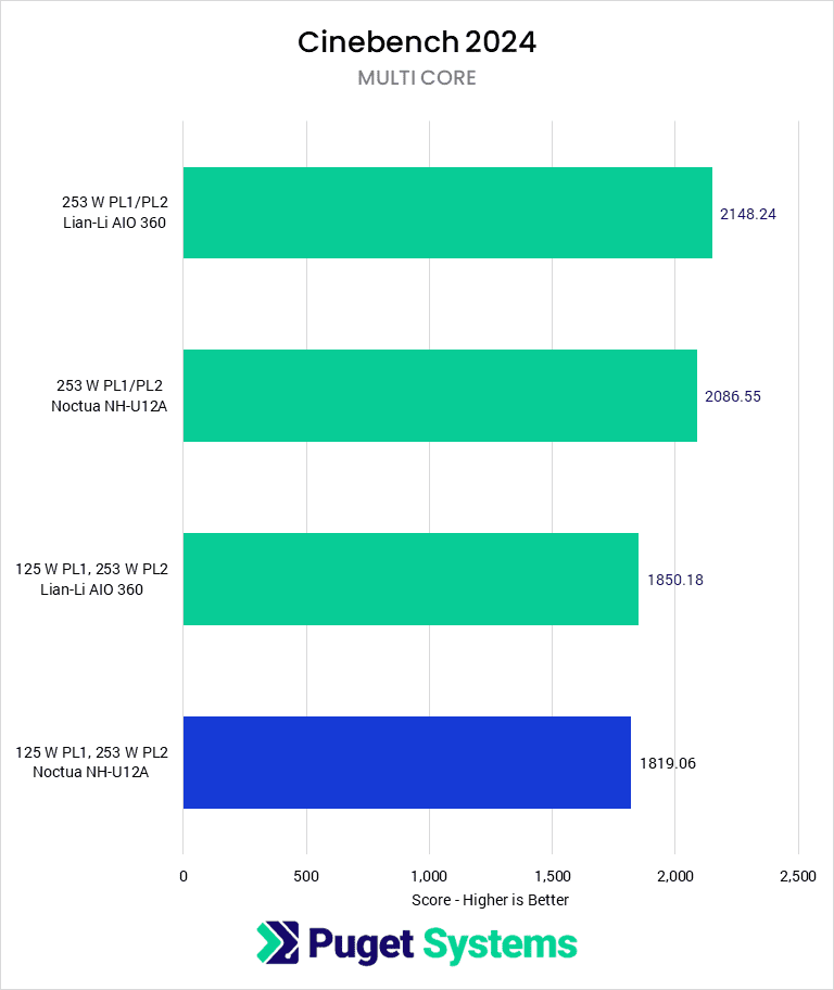 The tests that should best discriminate between coolers and power settings from our suite of benchmarks are CPU renderers, of which we tested 3. Cinebench 2024 shows a large 18% performance difference between the Galahad at 253 W and the Noctua at 125 W. It also appears that coolers matter here, at least at the higher power draw, as the larger cooler scores 3% higher than the smaller one.