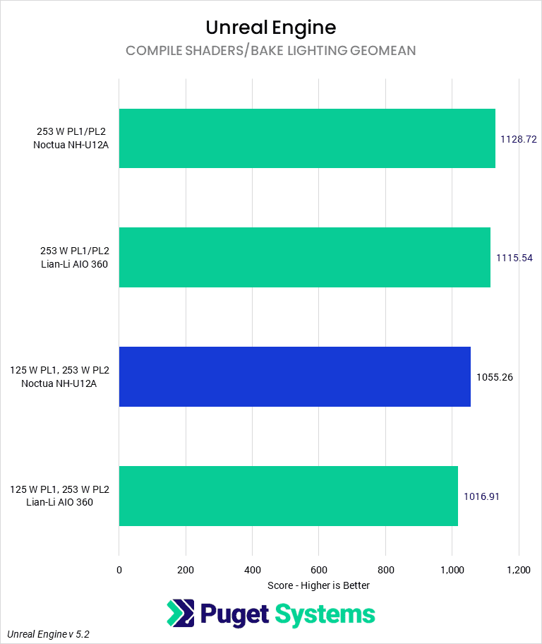 Our Unreal Engine CPU tests can tend to be somewhat more taxing on the processor than many of the prior tests, and we see that in the larger performance delta between power settings. Even if we only consider the average score at either power setting, the results at 253 W are 8.5% higher than at 125 W. The most optimistic reading of this chart increases that gap to 11%. It is also clear that cooler choice makes little difference here, as we see the Galahad performing worse at both power limits (although mostly within the expected error) than the NH-U12A.