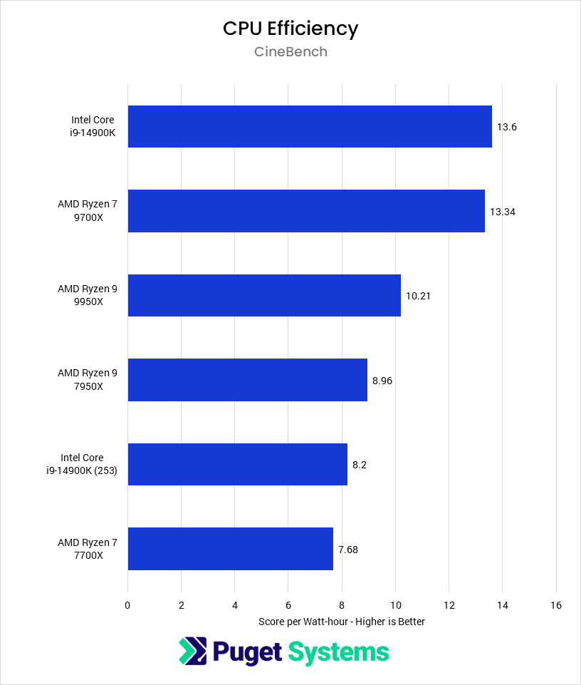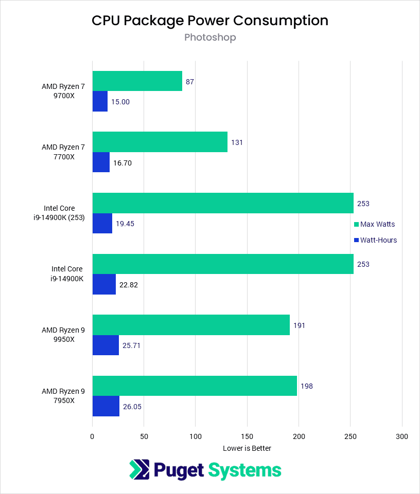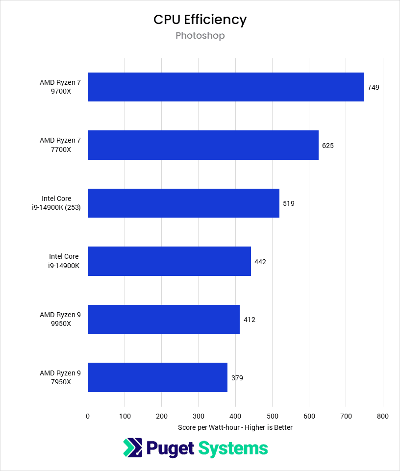 Moving on to Photoshop, we are technically looking at performance per watt-hour. Again, a Watt-hour is a unit of energy (like Joules) and a Watt of power. The 9700X here attains about 20% higher performance per watt-hour due in part to a lower power draw and, in part, to a higher benchmark score (by around 8%). This is less than we saw from Cinebench. While some of this is because Photoshop has some sections that are fixed-work, part of this is also because the 9700X and 7700X have much more similar power average power draws (58 W and 60 W, respectively). Photoshop is a light enough benchmark that the CPU frequently only uses a few cores, at which point the 7700X and 9700X draw nearly that same amount of power due to boosting algorithms. We see this more clearly with the 9950X, which is only about 10% more efficient by this metric than the 7950X.