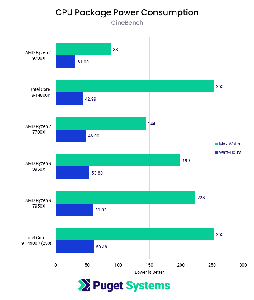 Finally, Cinebench is the only fixed-time benchmark we looked at. In this case, the total energy used really just depends on the average power draw. For most of the benchmark, the average and maximum power draw are nearly the same, although there are lower power sections while a render is initializing or finishing. This does mean that the overall efficiency gains are lower than relative TDP differences, but the 9700X still uses less power than the 7700X and the 9950X less than the 7950X.