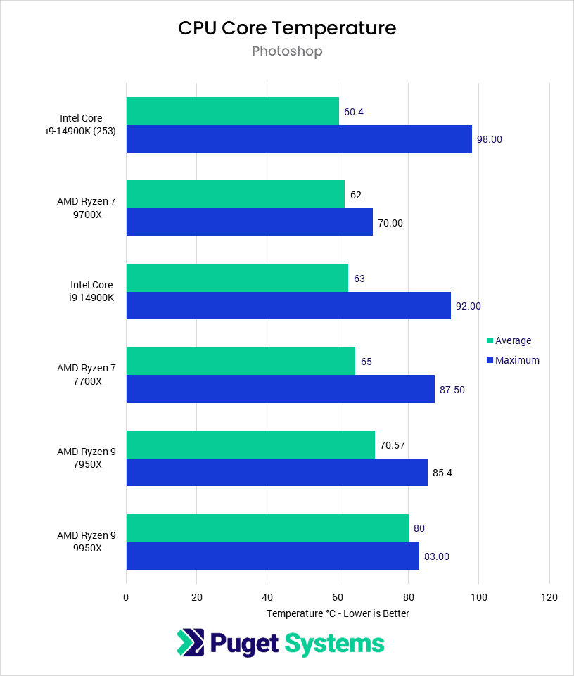 In Adobe Photoshop, we found that the 9700X and 7700X had nearly identical average temperatures. Since both processors averaged about the same power draw, this makes sense. However, we do see a much higher maximum temperature from the 7700X, likely due to the higher maximum power draw we saw. Overall, Photoshop is a light workload, and cooling is rarely a concern. Still, it is interesting to see how in these more lightly threaded applications, there is not a large difference gen-on-gen. The 9950X shows a similarly small gen-on-gen difference from the 7950X, with both having very similar average and maximum temperatures. In fact, the 9950X has a slightly higher average temperature.