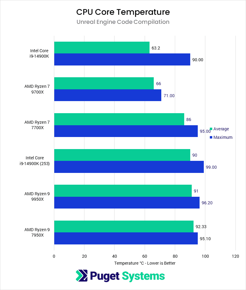 Unreal Engine, also being a heavy all-core workload, is basically identical to Cinebench, save that the average temperatures are slightly elevated, given the reasons stated above. Regardless, the temperature decrease on the 9700X, in particular, is impressive.