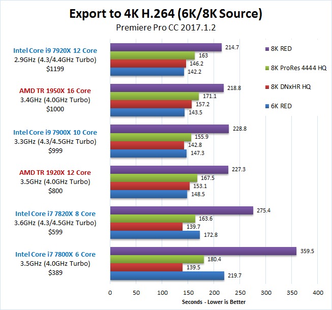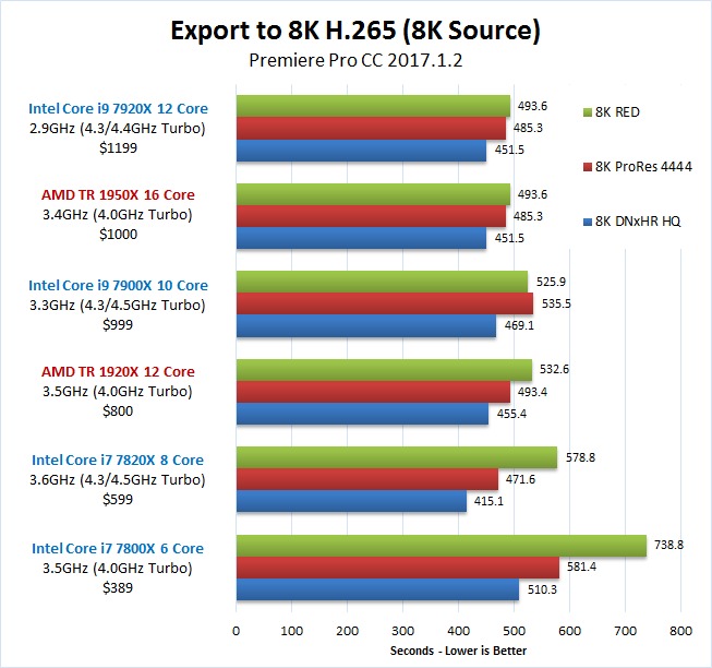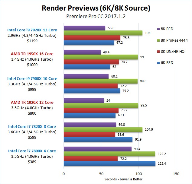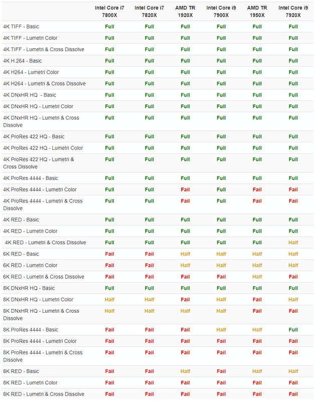 Using our score-based system, you can get a pretty decent idea of how each CPU might affect live playback performance. Honestly, the results were a lot closer than we expected with only the Core i9 7900X being truly better than the others. One thing we do want to point out, however, is that while the Threadripper CPUs had some issues with 4K ProRes 4444 timelines, they were able to play basic 8K RED timelines at half resolution – a feat that only the Intel Core i9 7920X could match.