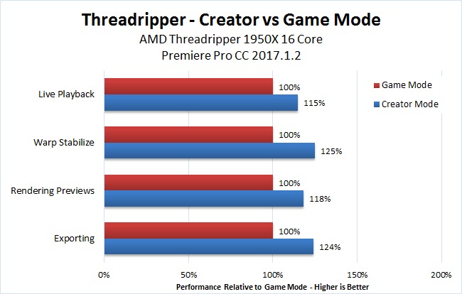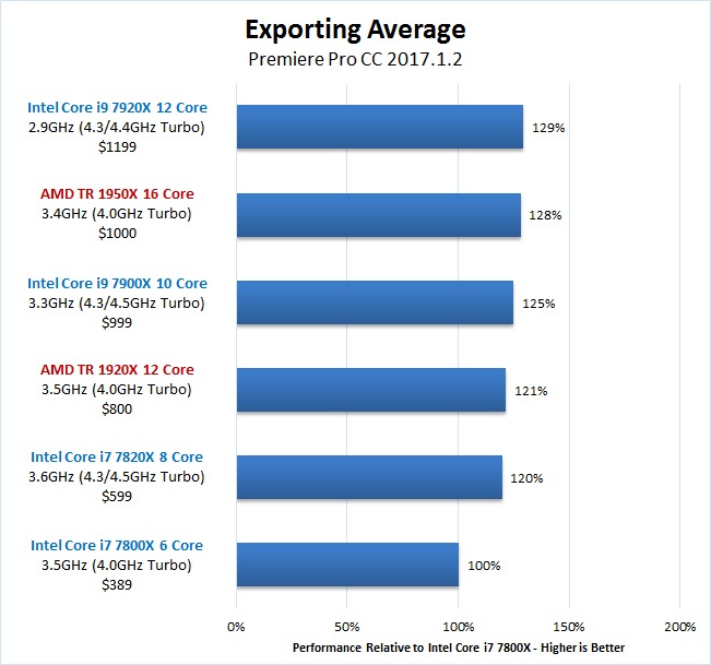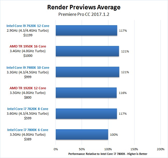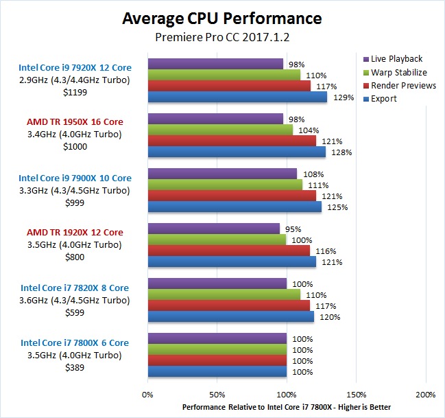Competition is a wonderful thing and one thing is clear: Threadripper is definitely a competitive product. Looking at the overall performance including rendering previews, exporting, warp stabilize, and live playback, we saw the following average performance from each CPU we tested: