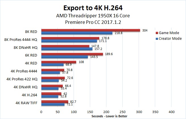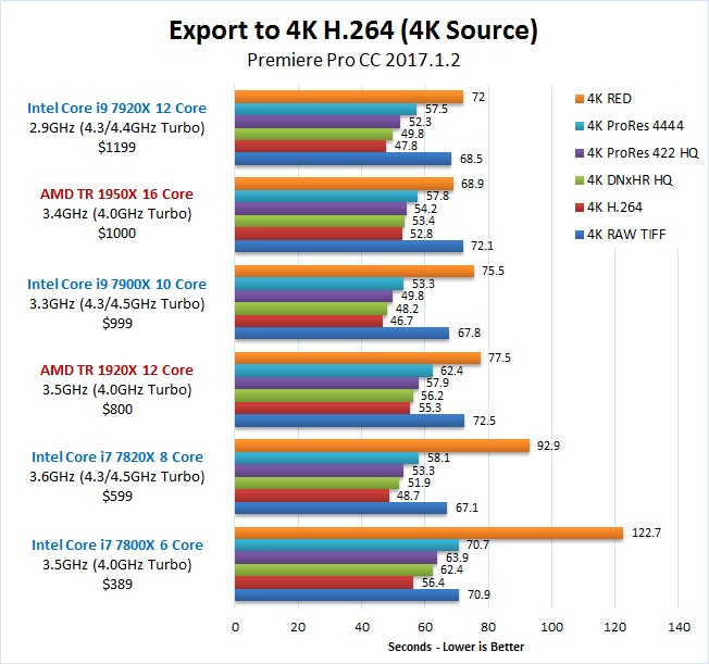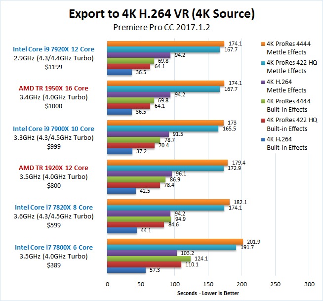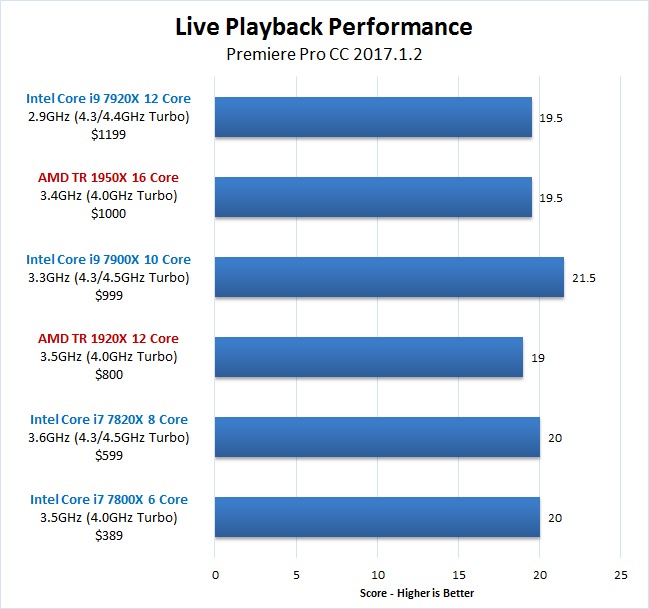 So is Threadripper a bad choice for a Premiere Pro workstation? If you just care about export performance, you probably wouldn't be able to tell the difference between a workstation using AMD Threadripper or one using Intel Skylake-X. However, the key area where Threadripper has issues is with live playback. It isn't really even that it is particularly bad, but Intel simply has a small lead in that area. Live playback is such an essential part of a video editing workstation that this alone keeps us from really recommending Threadripper for Premiere Pro. If you want to support AMD's efforts and help them continue to provide solid competition for Intel that is a completely valid reason to use Threadripper over Skylake-X, but otherwise Intel just has the stronger offering for Premiere Pro at this time.