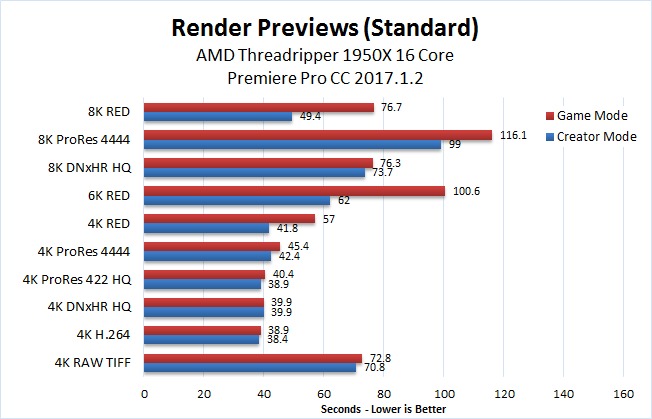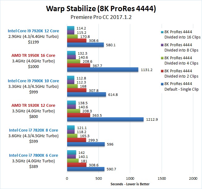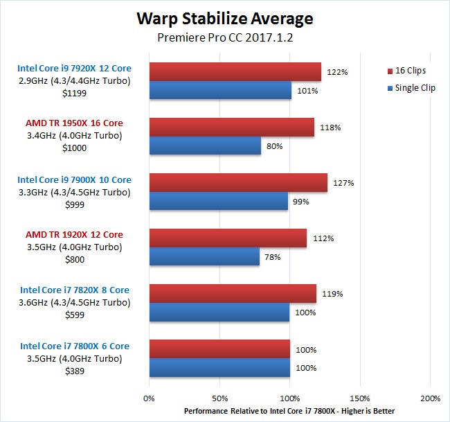 Unfortunately, the Threadripper 1950X 16 core has many of the same issues as the TR 1920X. It matches the Intel Core i9 7900X when rendering previews and is actually 3% faster overall when exporting but it has worse performance for both warp stabilize and live playback. More than anything else, it is the lower live playback performance that keeps the TR 1950X from being a better choice than the Core i9 7900X.