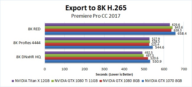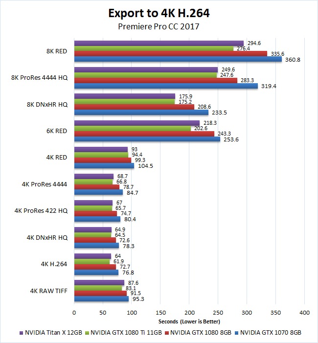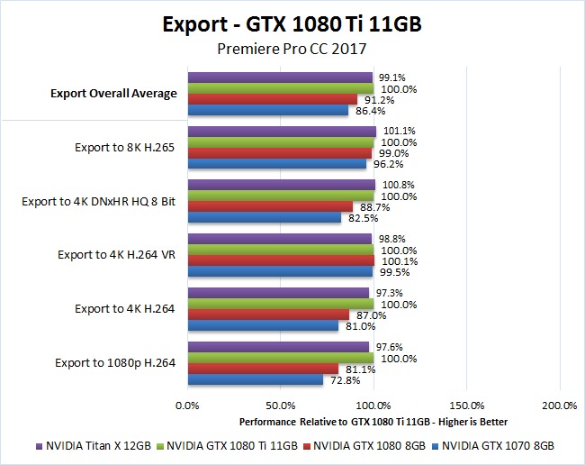 Our results when exporting are very interesting because at times (such as when exporting to 1080p) the GTX 1080 Ti is awesome -coming in at almost 20% faster than the GTX 1080. However, in other cases (like exporting to 8K H.265 or 4K H.264 VR) we didn't see much of a performance difference between any of the cards we tested. This is likely due to the fact that in those situations we are limited not by the performance of the video card but rather by something else in the system – most likely the CPU. In those cases, having a more powerful video card doesn't really help since there is a performance bottleneck elsewhere in the system.