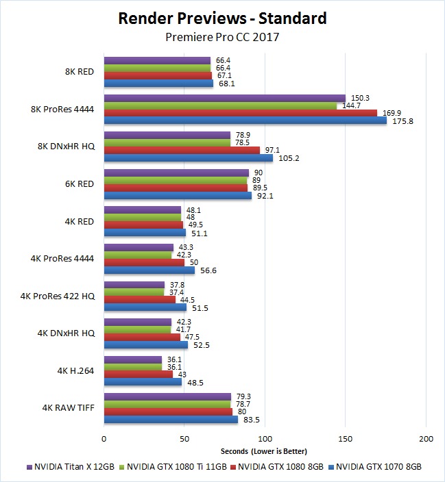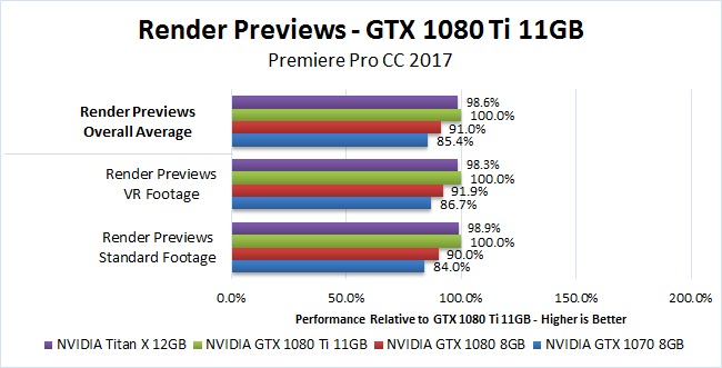 With that said, the GTX 1080 Ti 11GB did great when rendering previews. On average, it was about 15% faster than the GTX 1070, 9% faster than the GTX 1080 8GB, and even manages to be a small 1.4% faster than the Titan X 12GB. Considering the 1080 Ti is about 40% cheaper than the Titan X, this is an excellent result!