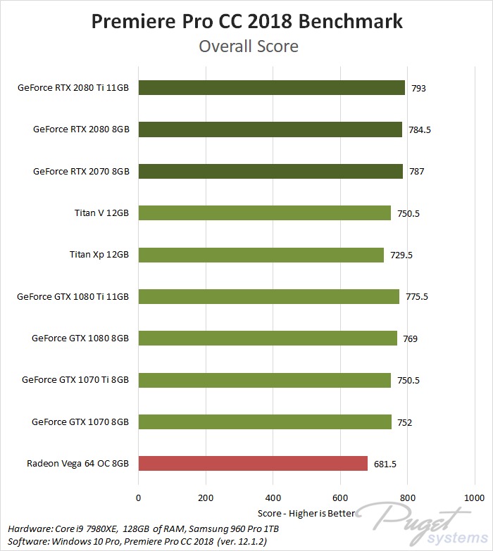 The new RTX cards are certainly not bad for Premiere Pro, but the difference between any mid/high end NVIDIA GPU is going to be very minor. However, this does make the RTX 2070 a solid choice as it performs just as well as the much more expensive models.