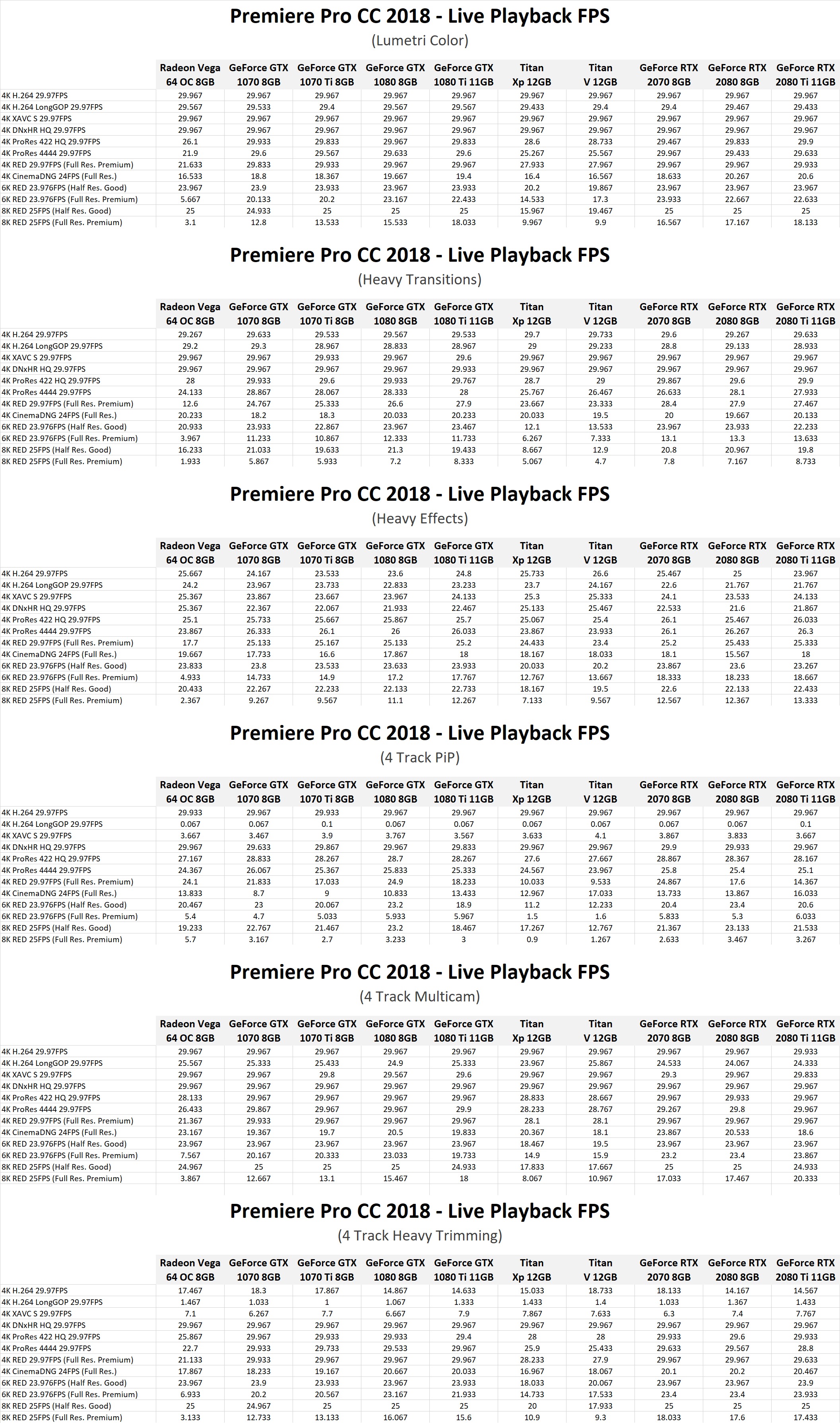 Starting with the non-RED footage, all the GPUs we tested (including the new RTX cards) were close to identical. There is a slight difference when using RED media, but even then the RTX cards were only slightly faster than the current GTX cards. Between the RTX models, there was really no difference at all so getting a RTX 2080 Ti shouldn't give you any higher FPS for live playback than even the RTX 2070.