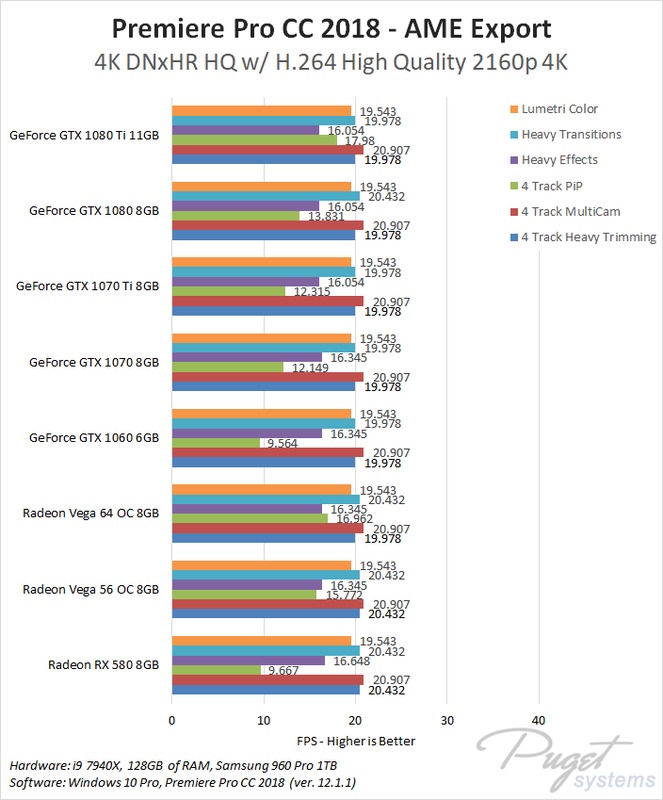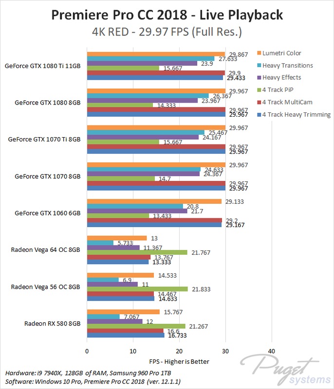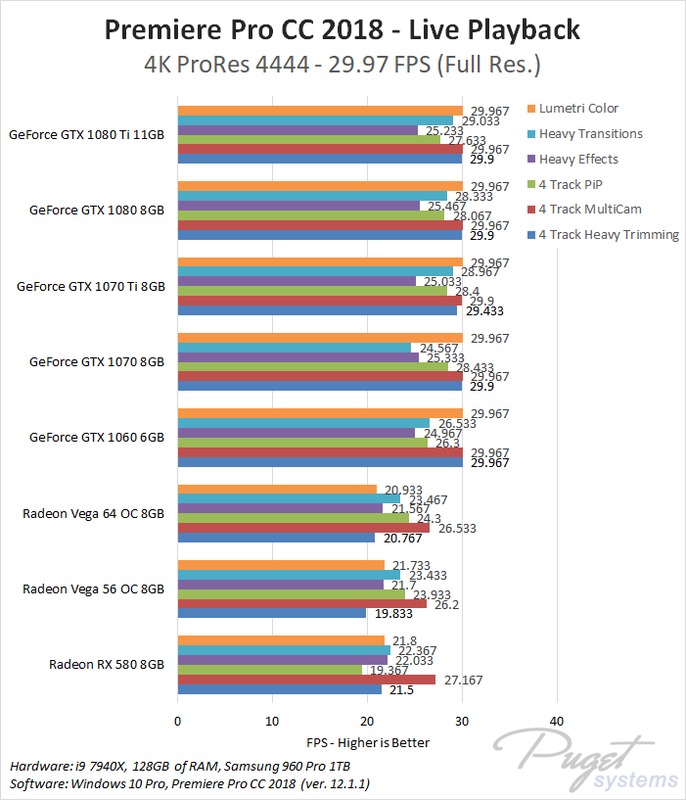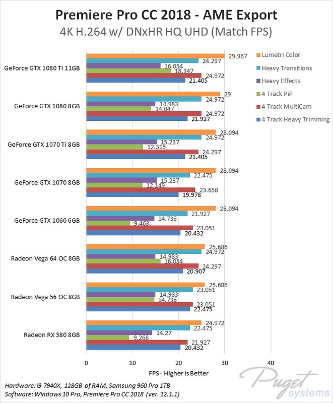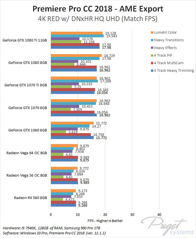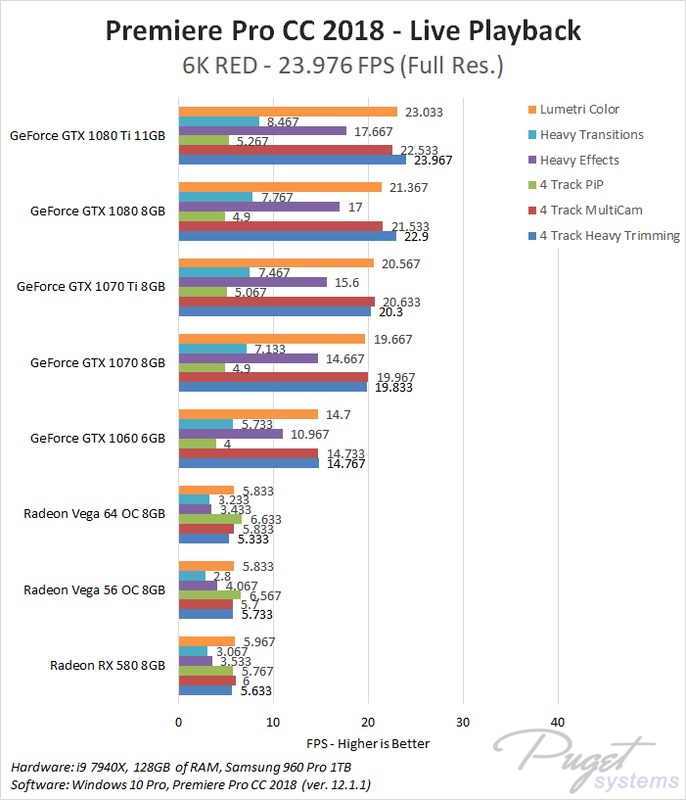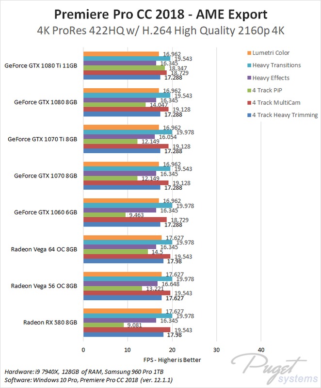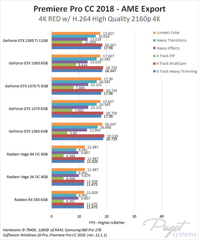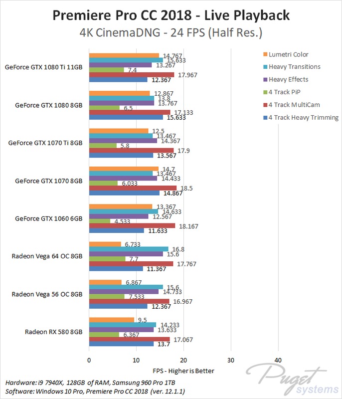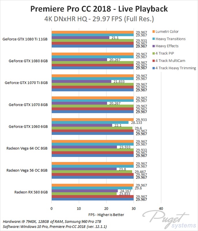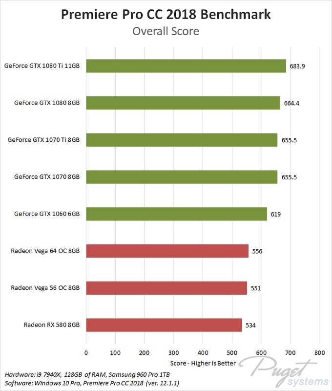 While GPU acceleration has become fairly common in Adobe applications, in most situations it is much more important to have a powerful CPU, plenty of RAM, and fast enough storage. Despite this, a popular request we get is to compare AMD's Radeon Vega video cards to NVIDIA's GeForce cards. In previous articles we have compared these cards in both Photoshop and Media Encoder, but now it is time to take a look at how they do in Premiere Pro. It is worth noting that while we will be focusing on Premiere Pro performance in this article, choosing a specific GPU to use is a much more complicated topic. Many other factors including current pricing, reliability, power draw, noise level, and available cooler designs are all things that need to be considered.