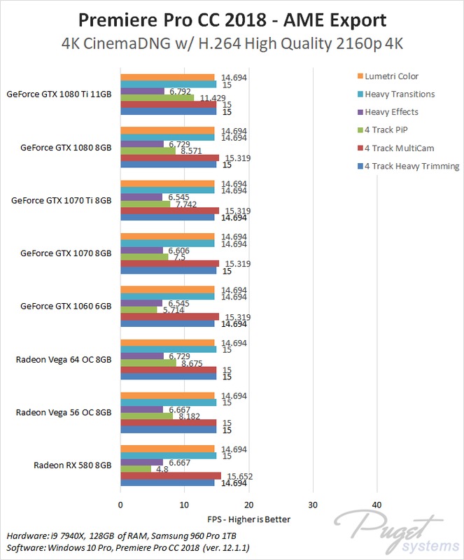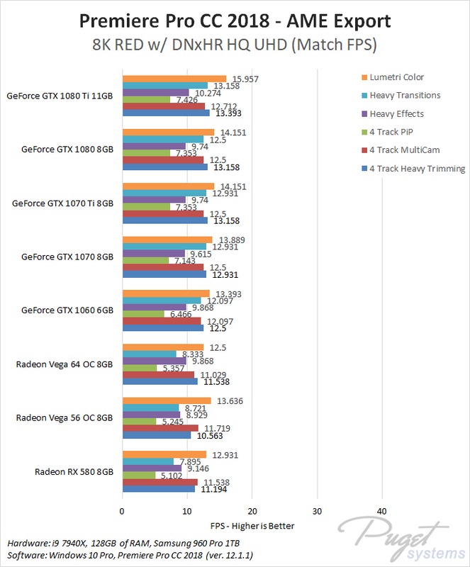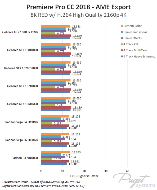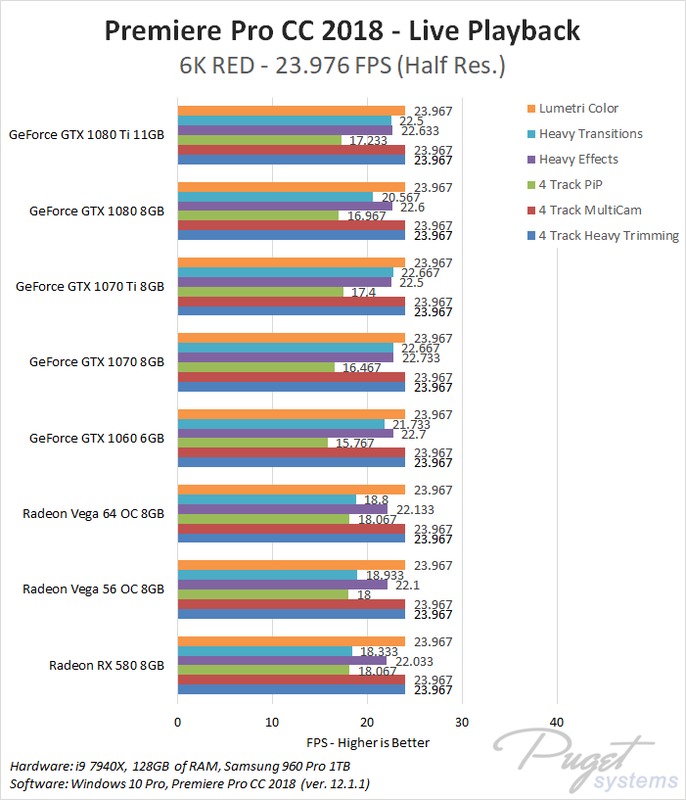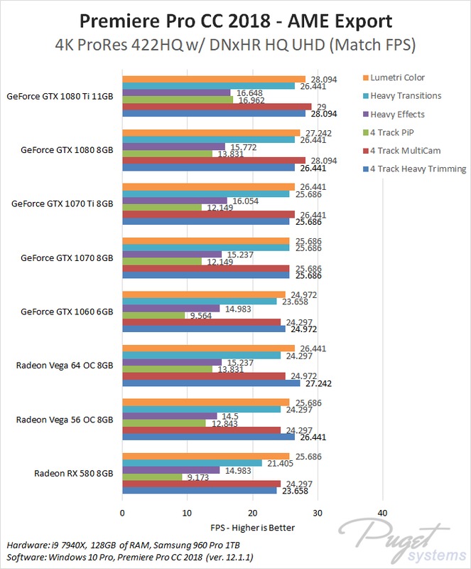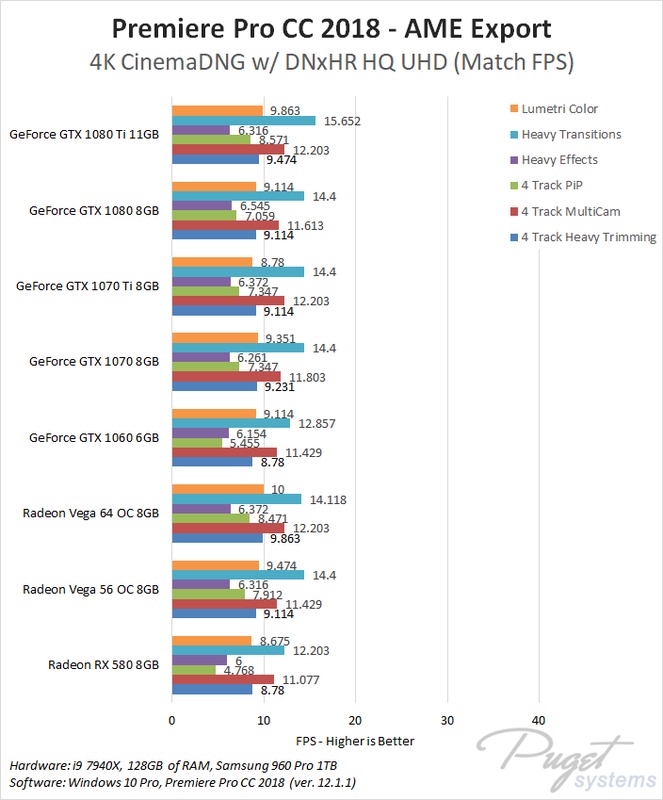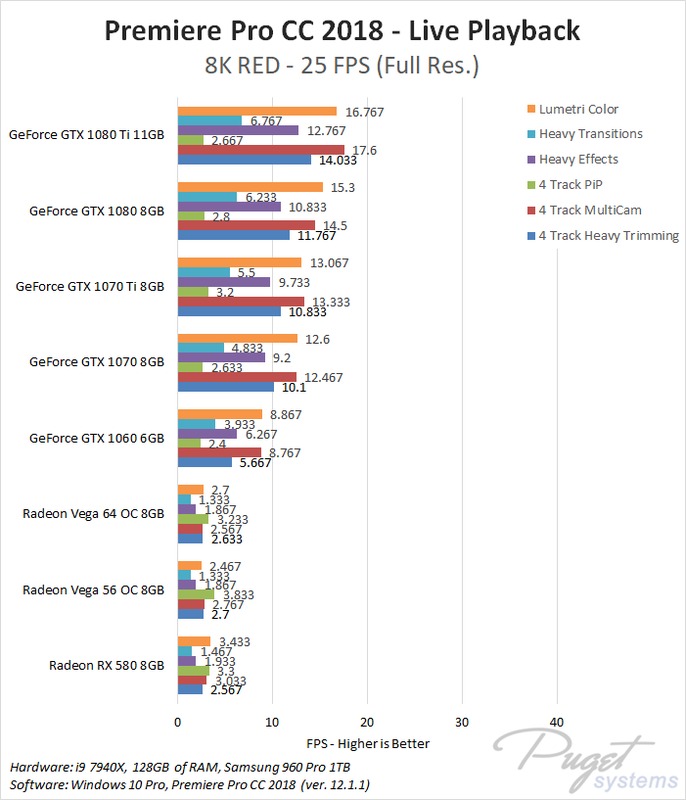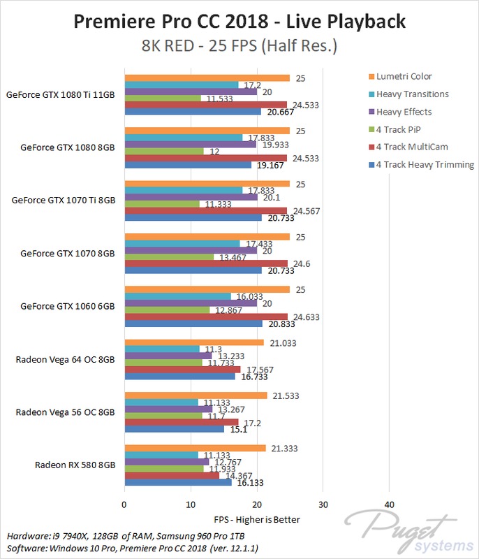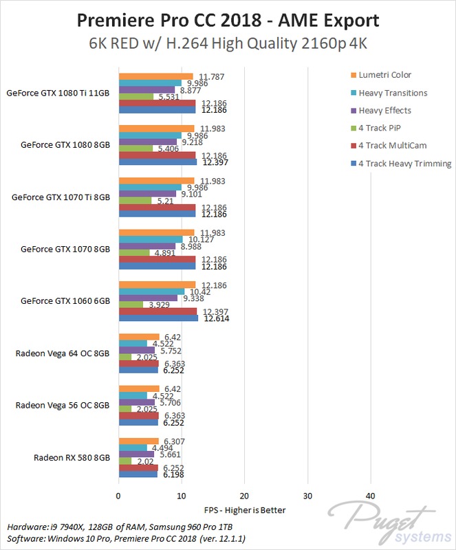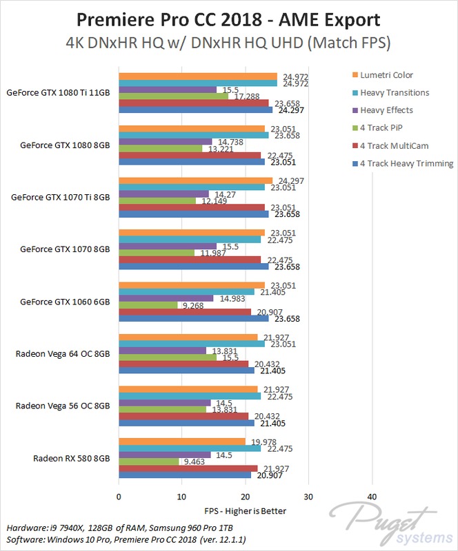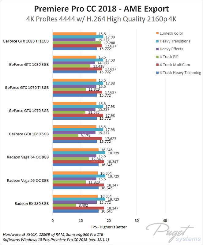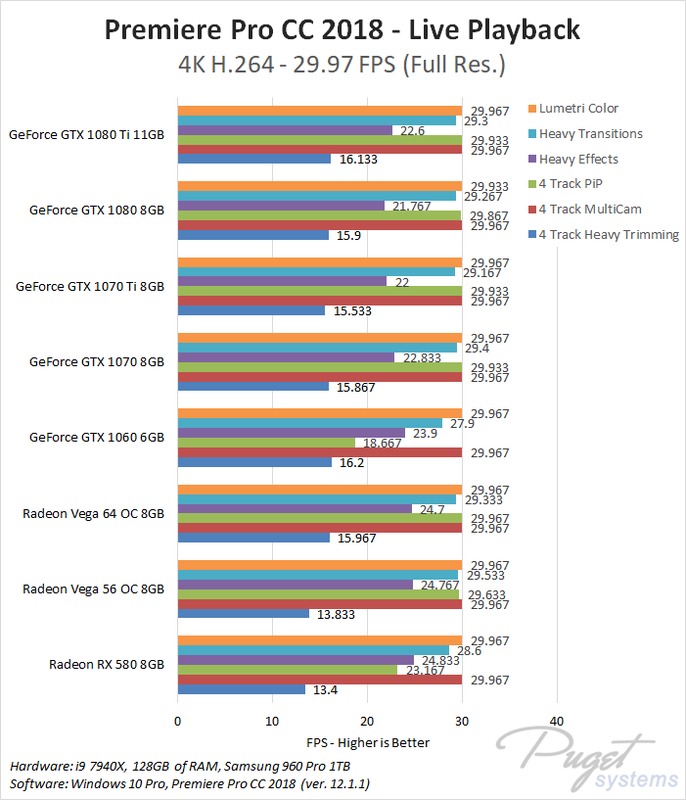 While GPU acceleration has become fairly common in Adobe applications, in most situations it is much more important to have a powerful CPU, plenty of RAM, and fast enough storage. Despite this, a popular request we get is to compare AMD's Radeon Vega video cards to NVIDIA's GeForce cards. In previous articles we have compared these cards in both Photoshop and Media Encoder, but now it is time to take a look at how they do in Premiere Pro. It is worth noting that while we will be focusing on Premiere Pro performance in this article, choosing a specific GPU to use is a much more complicated topic. Many other factors including current pricing, reliability, power draw, noise level, and available cooler designs are all things that need to be considered.