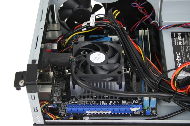 Mini-ITX cases tend to be very compact, so one major consideration when choosing a case is the height of the CPU heatsink you are using. Due to the limited amount of slim AMD heatsinks available that will fit on this motherboard, you will largely be limited to using the stock CPU cooler. This means that this board will not fit into ultra-compact cases such as the Antec ISK-100 as the heatsink is simply too tall. While it is tight even in a slightly larger case like the Antec ISK 310-150, it is able to fit without too many issues.