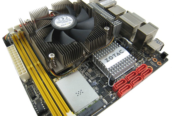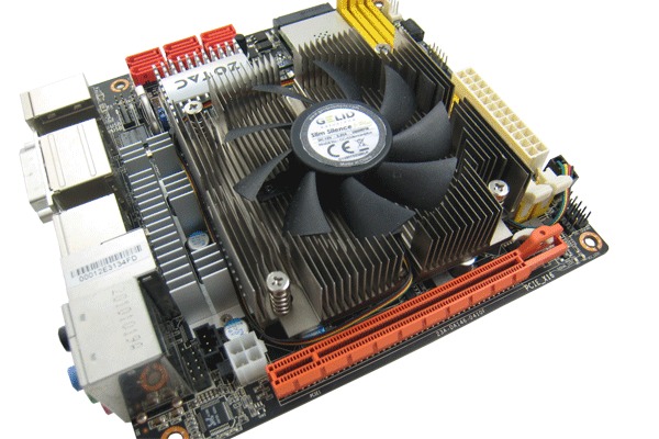 As with any small form-factor system, spacing is very tight, but we had no problems with the heatsink contacting surrounding capacitors or RAM slots. The side fan fit just fine, providing ventilation to the chipset heatsink