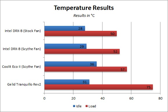 To test the thermal performance of these coolers, we recorded the temperature at both idle and load with the hardware listed above. We will be testing the Intel Liquid cooler, a Coolit Eco II, and a Gelid Tranquillo Rev2. We also tested the Intel DRX-B cooler with both the included fan as well as the same fan we use on the Coolit Eco II (Scythe Slip Stream 1300RPM 120mm PWM).