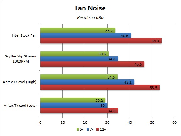 Starting with the fan noise, you can see that while the Intel fan had the highest CFM in our airflow tests, the Antec TriCool fan on high is actually louder when running at both 5 and 7 volts. This suggests that the Intel fan is pretty efficient in the low to mid RPM ranges. The Scythe fan however is much quieter than the Intel and Antec fans coming in ~8 dBa lower at 12 volts and ~3 dBa lower at 5 volts. This indicates that the Scythe fan should be noticeably quieter both at idle and load.