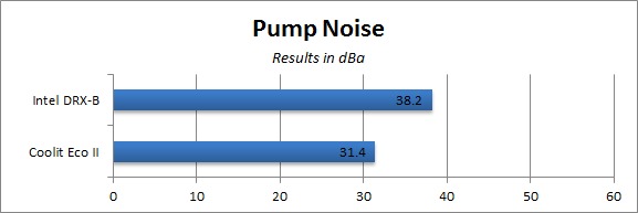 Moving on to the pump noise, we ran both the Intel DRX-B pump as well as a Coolit Eco II pump at 12v as a point of comparison. The Coolit Eco II came in at only 2.4 dBa above ambient, while the Intel DRX-B is a full 6.8 dBa above that. The pump noise will be somewhat lessened by the computer's side panels and the fact that it is located in the very center of the machine, but the variance is large enough that the difference in noise levels will be noticeable as long as the system is in a fairly quiet environment.