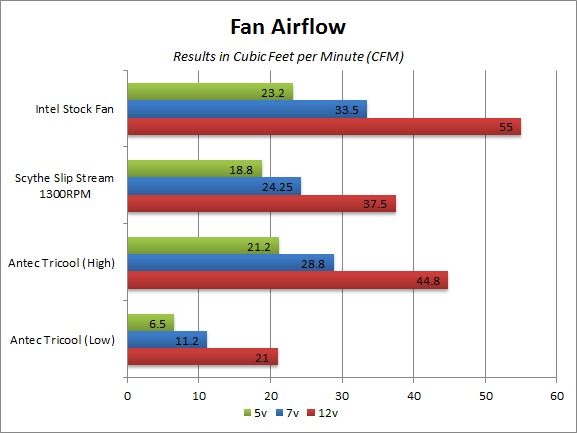 Airflow readings were taken at 5, 7, and 12 volts to simulate multiple levels of fan speeds. 5v will give us roughly the same RPM that most fans will be spinning in an idle system, while 12v will simulate a system under full load.