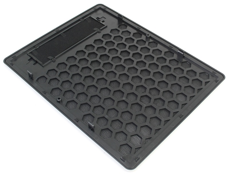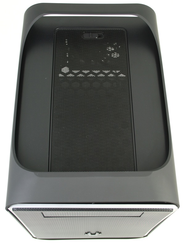 Moving to the top of the chassis, you can see the two top plastic handles with a rubber coating (which are identical to the "feet" on the bottom of the chassis) and a 130mm x 185mm bezel of the same style and material composition as the front bezel. Instead of being held in place with plastic tabs, however, there is a switch that keeps this bezel in place. To remove the bezel, slide the switch to the side and lift up on the bezel (you may need to push up on it from the inside of the chassis). With the bezel removed, you have access to the two top 120mm fan mounts.