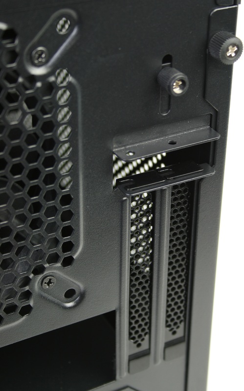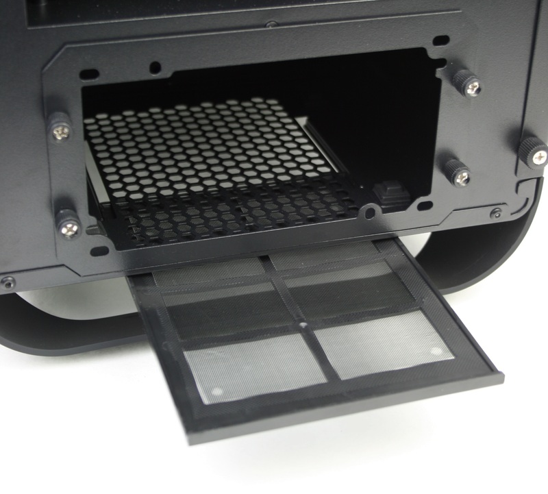 Finally, the rear of the chassis accommodates the rear 120/140mm fan mount, motherboard I/O panel, PCI slots and power supply mount. PCI cards are held in place with a combination of a plate and standard thumbscrews. In order to mount the power supply, you first need to remove the PSU mount plate from the chassis, secure the plate to the PSU, and reinstall both the plate and the power supply into the power supply cavity. Right below the power supply mount is the filter for the power supply's intake fan which can be removed by simply pull it out from the chassis.